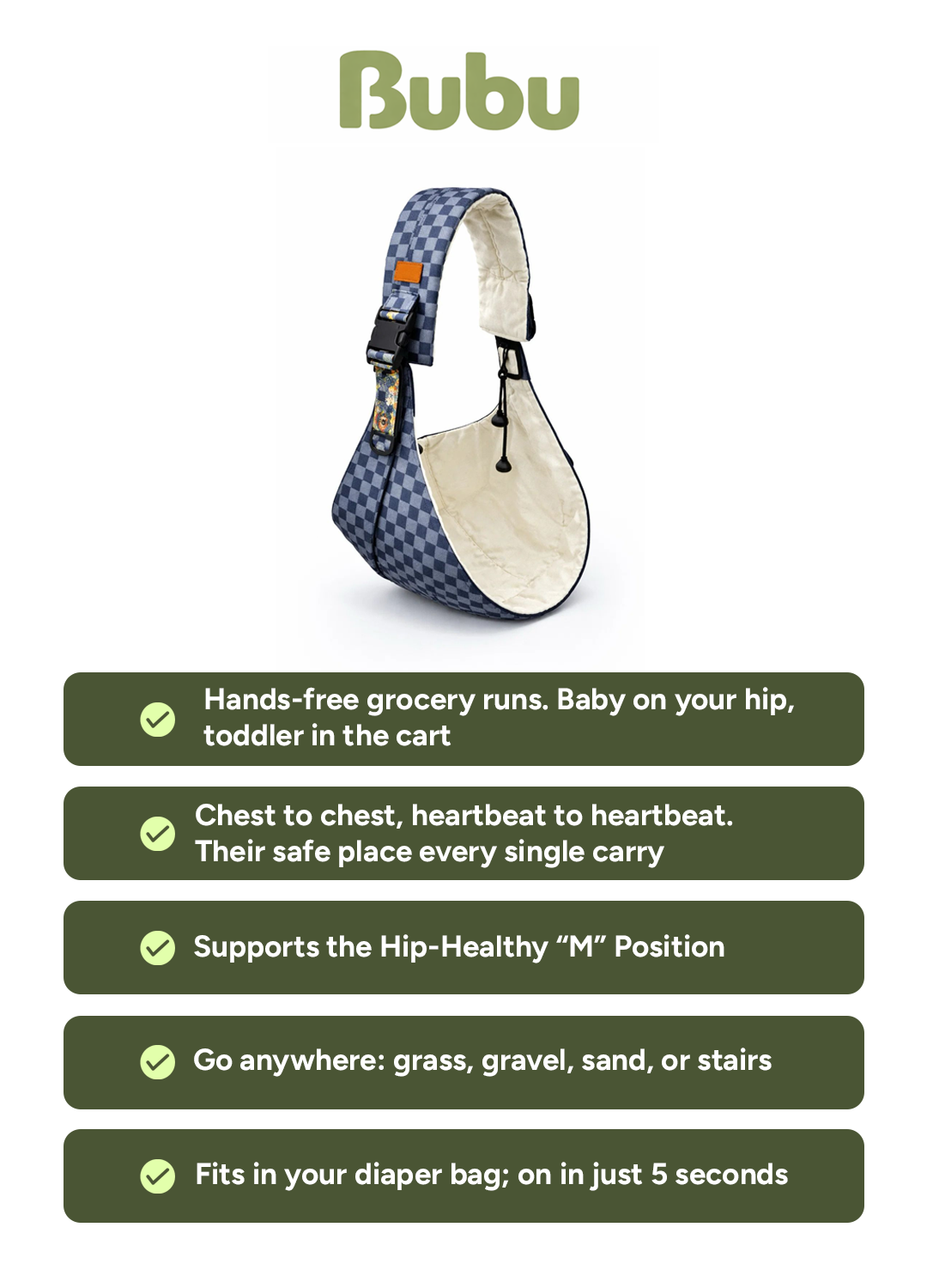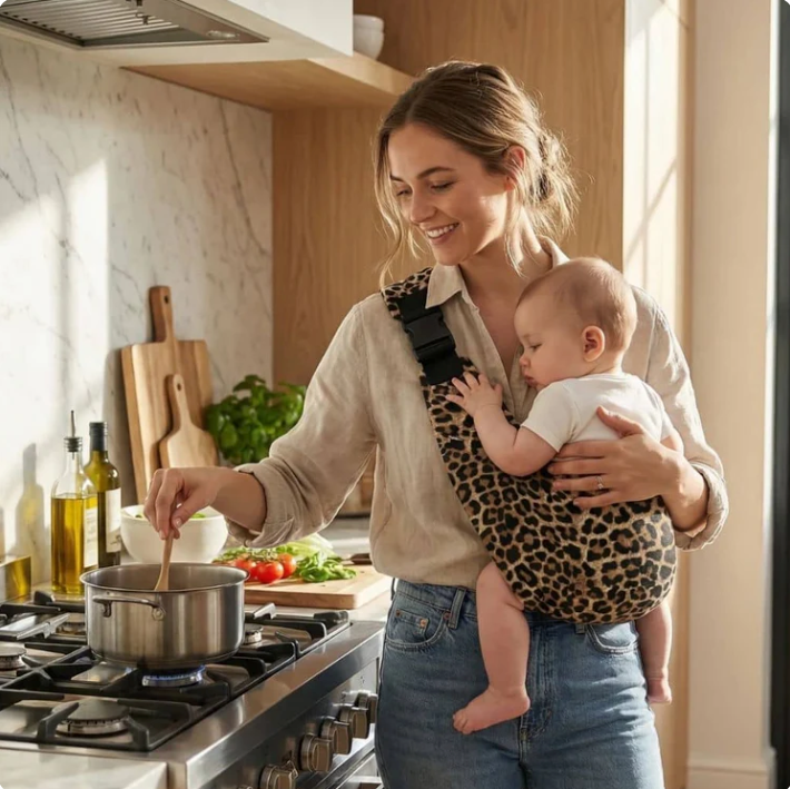 The Bubu Sling slips on in seconds, distributes the weight evenly across your shoulder — so you can say yes every single time, while still getting everything done completely pain-free.